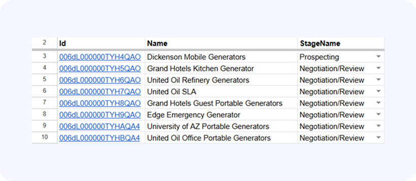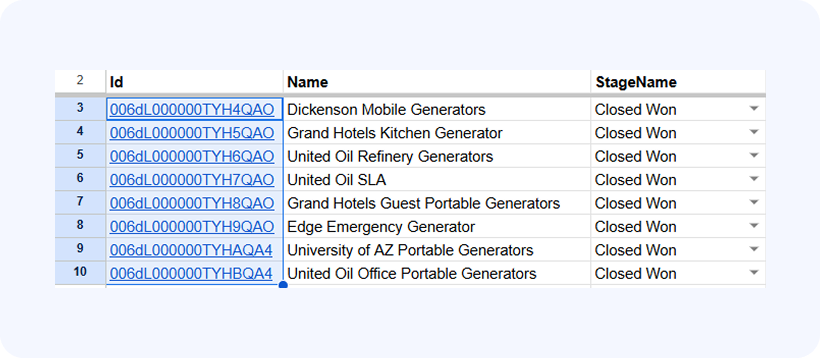In our example here we’ll use G-Connector to update the stage of all opportunities under one specific account. We’ll use the following query to pull the data: