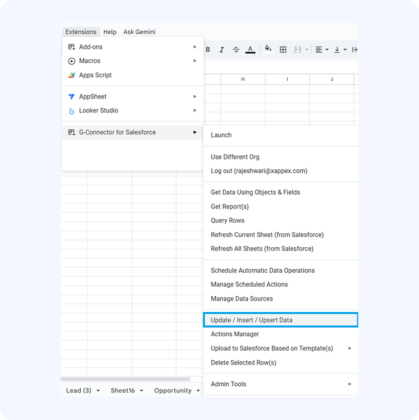 Then we’ll click Extensions -> G-Connector for Salesforce-> Update/Insert/Upsert