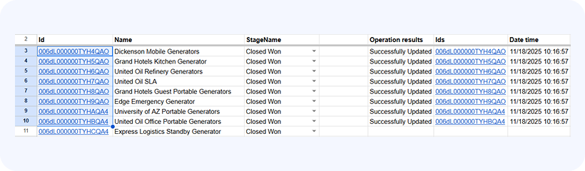 Now we want to change the stage of all four Opportunities to Closed Won. After the stage has been changed we’ll select the rows of data so that the selection spans across all the records that we want to update (it doesn’t matter if the selection spans across one or multiple columns.