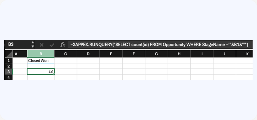 =XAPPEX.RUNQUERY(“SELECT count(id) FROM Opportunity WHERE StageName =’”&B1&”‘”)