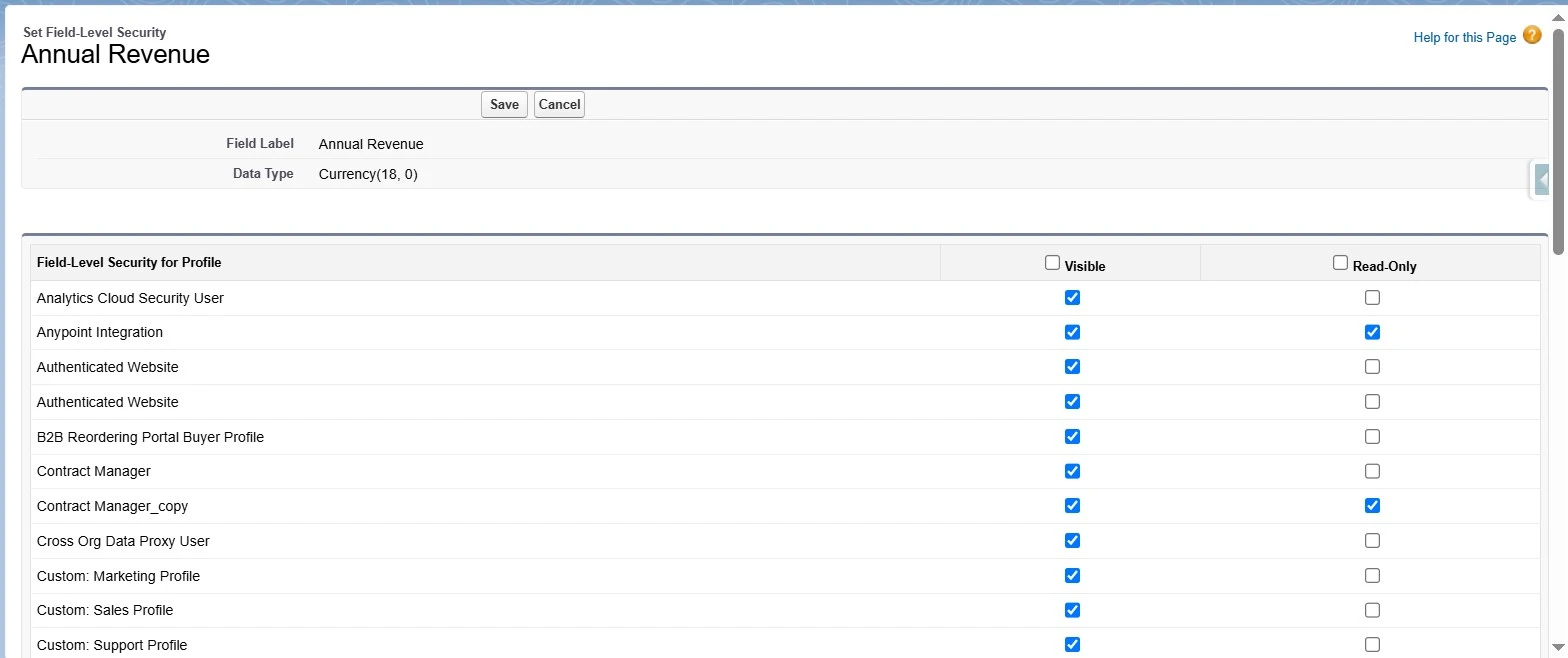 - Field visibility is configured at the Profile and Permission Set level.