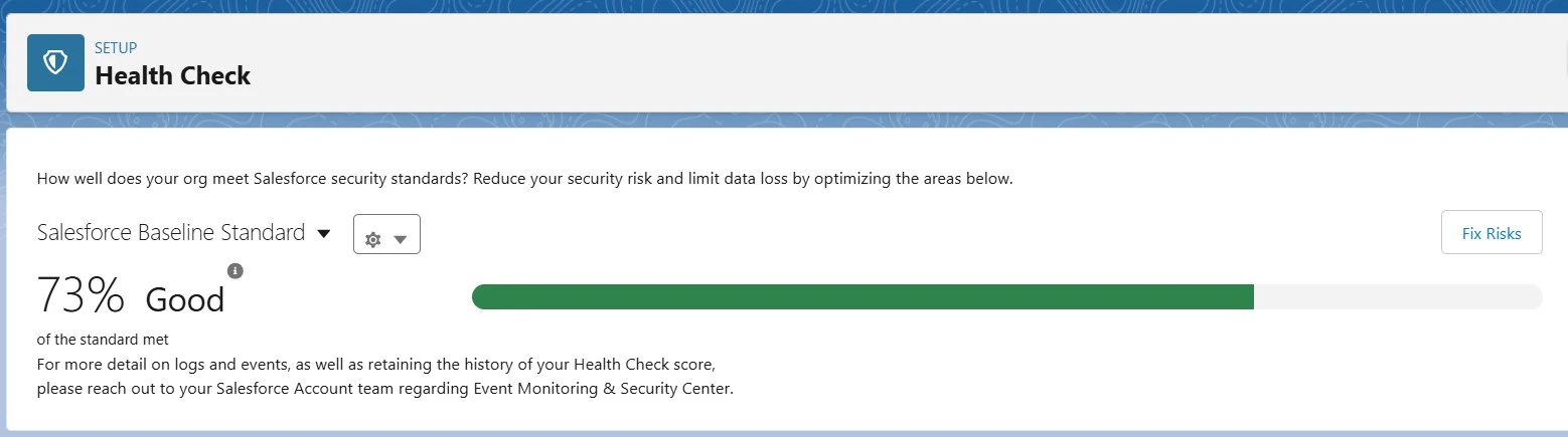 - Salesforce Health Check provides a centralized security dashboard that highlights risks and provides recommendations to improve security settings.
