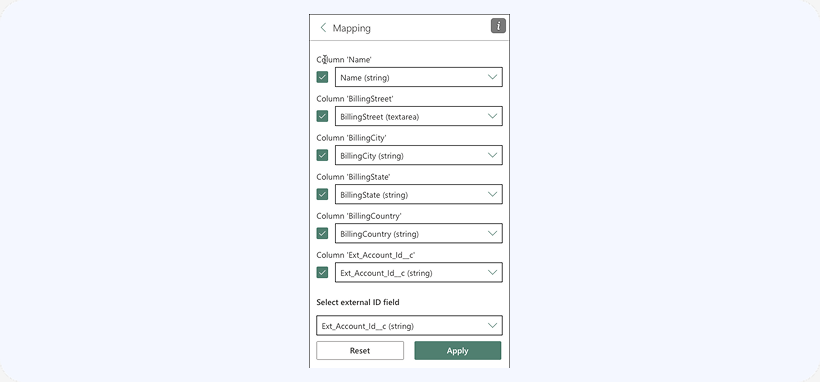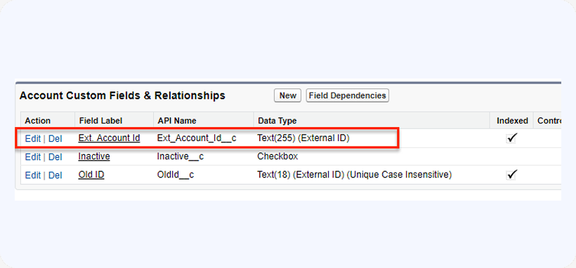 In our demo scenario, Accounts need to be synchronized with an external system, and therefore the Account object has a field named Ext. Account Id.