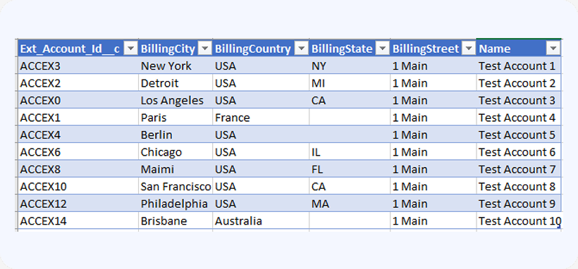 After you click Run and Save or Run in the dialog box above, the new contacts will get created and linked to the accounts identified by the corresponding external id. The Salesforce Ids of the newly created records will be also populated in the Id column: