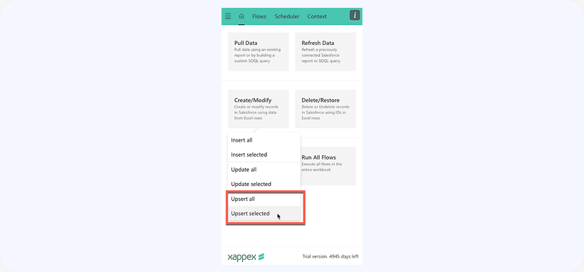 Now to do an Upsert, click on Create/Modify button in the XL-Connector 365 sidebar, then choose whether to Upsert all rows in the current range or only selected ones: