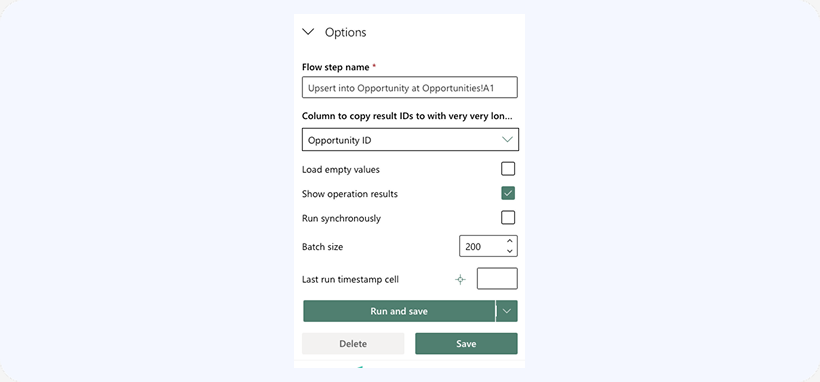 Click on Run and Save to run the Upsert operation according to the provided settings and save all the settings as a reusable Flow Step. In this case you’ll be able to run the same Update operation again from the same area in your sheet with a single click on the Run Flow or Run Flow Step button.