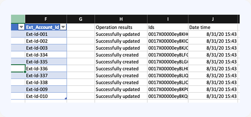 After the operation is completed, all operation results, along with the updated record Ids will be written on the right from your data, one column over: