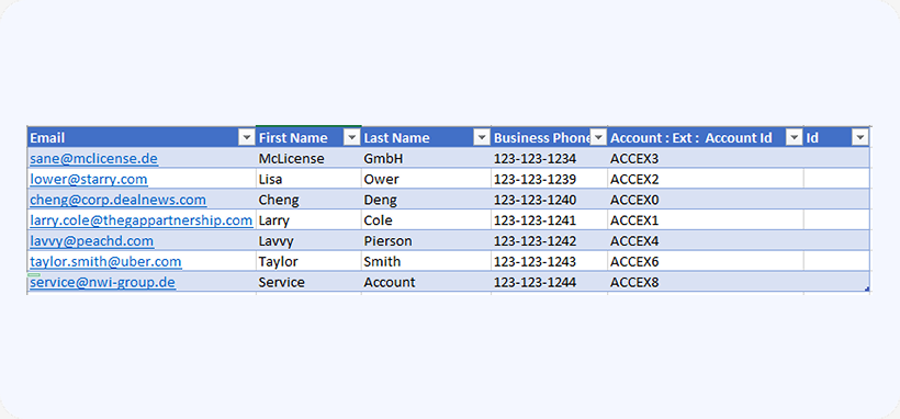 For the purpose of this demo the Contact does not have an external Id column. We’ll create a spreadsheet with new contacts as follows: