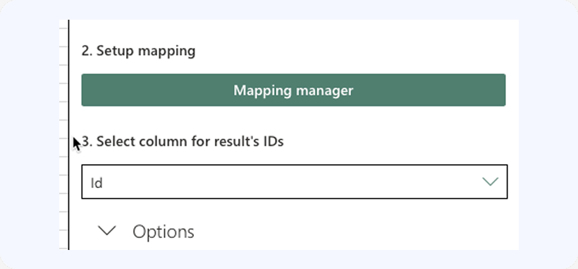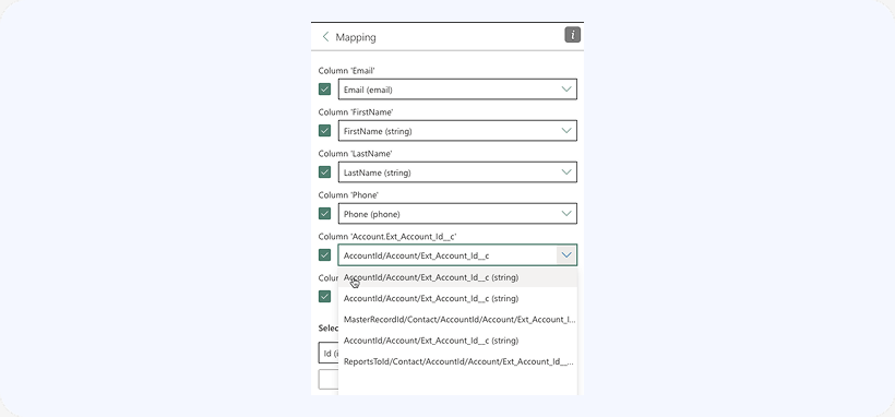 Since in this specific case we are inserting new records, you need to select the dummy Id column in this drop-down. Make sure to map this column to the Id field on the Contact object. We’ll also populate that column with the Salesforce Ids by selecting that column in the Select column for result Ids setting: